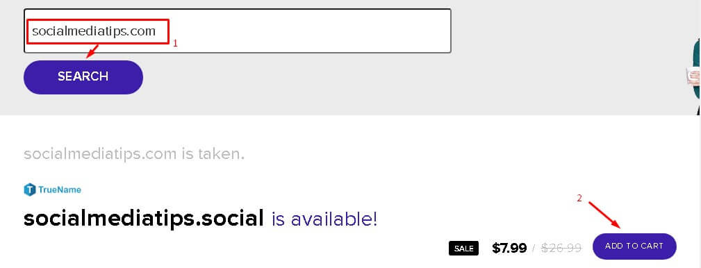 تختلف خطوات الشراء من شركة للأخرى ولكن الفكرة العامة ثابتة، فبمجرد أن قمت باختيار اسم مناسب لموقعك حان الوقت لتسجيله وشرائه بالضغط على كلمة شراء بجانب الدومين، أو إذا كان الموقع باللغة الانجليزية إضغط على كلمة Buy أو Add To Cart و سيخبرك الموقع بتكلفة الدومين السنوية.