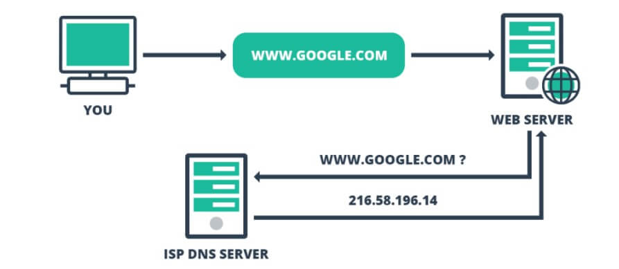وبالتالي عند كتابة اسم دومين خاص بأي موقع إلكتروني في شريط المتصفح يبدأ بالبحث عن عنوان IP مطابق للاسم الذي كتبته، وهنا تكون وظيفة الـ DNS وهي اختصار لكلمة Domain Name System ويعرف بـ “نظام أسماء النطاقات”، والذي يُخزِن أي معلومات تخص الموقع في قاعدة بيانات خاصة به بحيث يبدأ المتصفح بجلب تلك المعلومات حتى يتمكن المستخدم من عرض الموقع في بضع ثوانٍ.